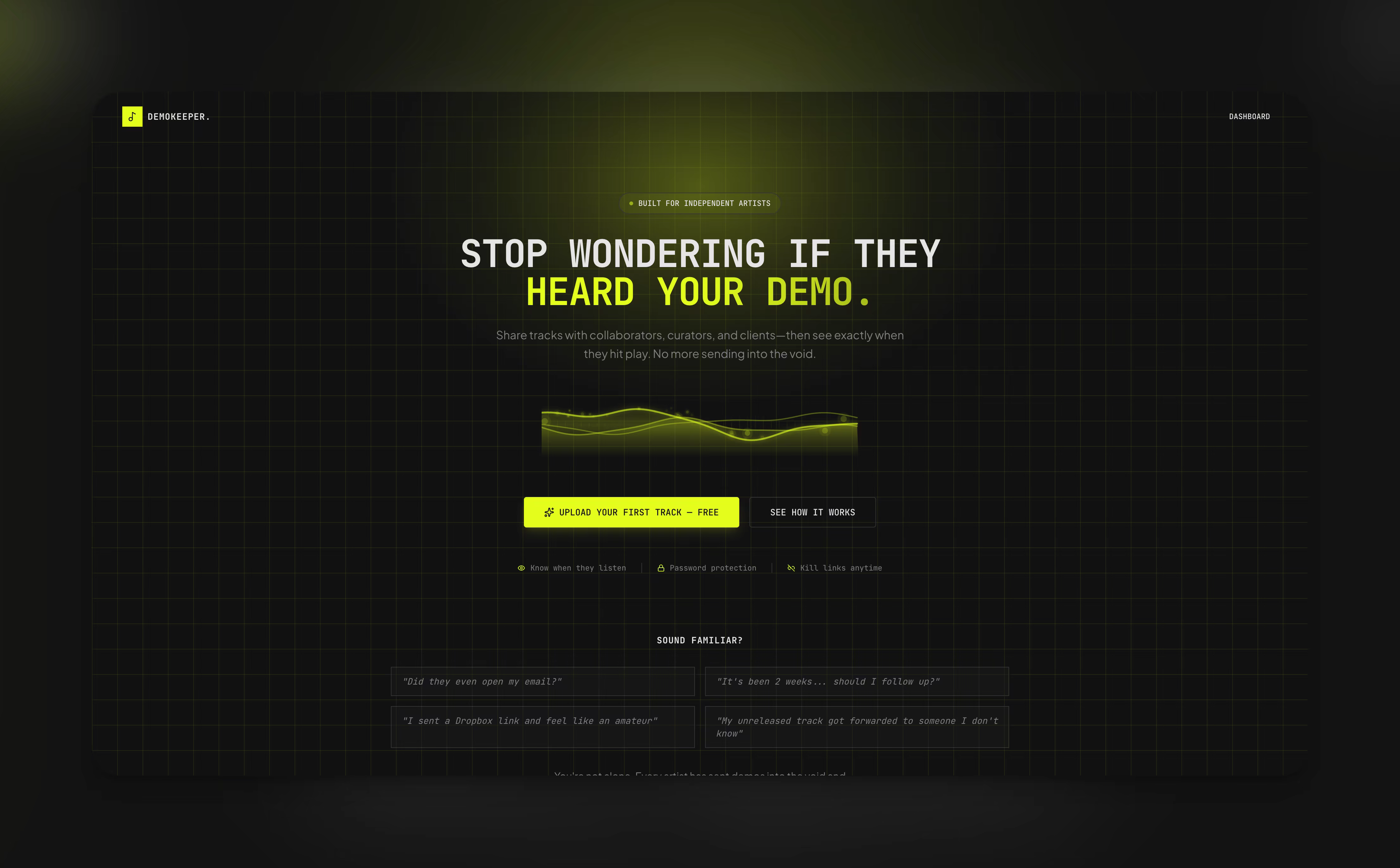 DemoKeeper helps independent artists stop wondering if their demos were heard. Built for producers, artists, and audio professionals, the platform provides proof-of-listen analytics, secure link sharing, and real-time notifications.